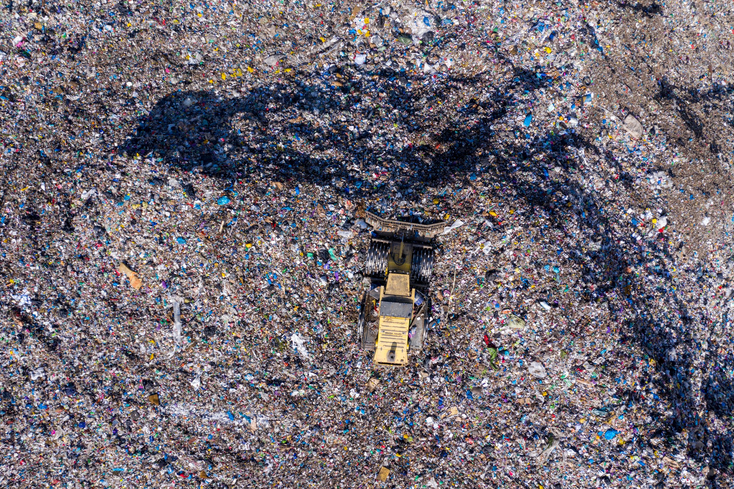 Aerial top drone view of large garbage pile, trash dump, landfill, waste from household dumping site, excavator machine is working on a mountain of garbage.